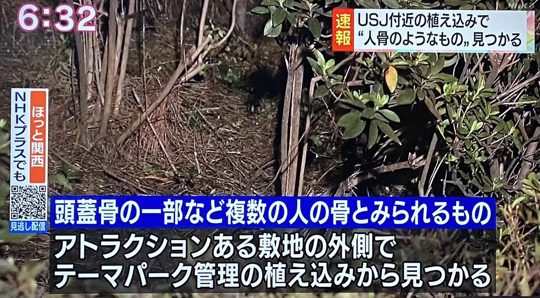 23 hours agoユニバーサルスタジオジャパンの近くで人の骨のようなものが見つかった12日USJの職員から植え込みの中から人骨を発見したと通報. 20 hours ago12日午後2時半ごろ大阪市此花区のユニバーサルスタジオジャパンUSJの従業員から歯の付いた人の骨のようなものが見つかったと. 20 hours ago12日午後1時半ごろ大阪市此花区桜島2のユニバーサルスタジオジャパンUSJの敷地内の植え込みで作業中の男性従業員が複数の人骨の.